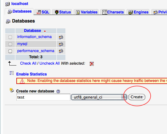 First, click on the "Databases" tab. Then, in the space provided, enter a name for your new database. I'm going to keep mine very simple for you and simply enter test. Finally, change the Collation to utf8_general_ci and click on the Create button: