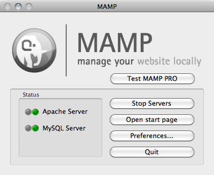The Pro version is a trial of their industrial-strength server; we don't need that, so we'll be using the plain old MAMP application. Opening the MAMP folder brings you to the MAMP application, which starts up easily. Both the Apache and MySQL Servers start automatically and you can see the progress right away with their convenient red light / green light set up. Once the lights turn green (about 2 seconds), you're ready to go: