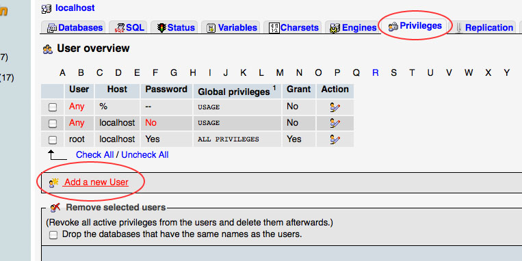 Now, of course, you need a username and password so that Drupal can access your database. So, go back to the main PHPMyAdmin page (click on the logo near the top left of the page) and click on the Privileges tab. From there, click on the link that reads Add a new user: