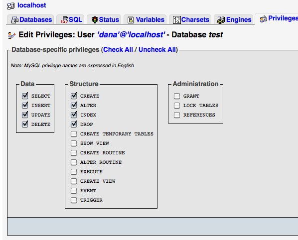 There are eight (8) privileges that you are going to choose. These are SELECT, INSERT, UPDATE, DELETE, CREATE, DROP, INDEX and ALTER. Check the corresponding boxes and click on "Go".