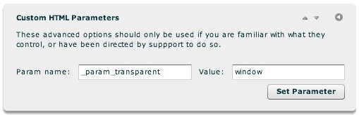 If you're not actively taking advantage of the slideshow's support for a transparent background, you should disable transparency when using a 3D image display element. This will allow the slideshow to render more quickly, boosting performance. To disable transparency, the wmode SWF embed parameter must be set to window . This can be done in the Custom HTML Parameters pod in the Global Configuration and Playback Settings section. The Param Name must be set to _param_wmode and the value set to window :