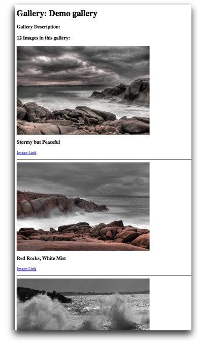 The generated HTML produces a page which appears like this, listing all galleries and their images: