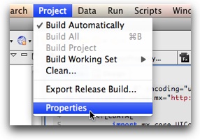 To set the required Flash Player version, open the Project Properties dialog by selecting Project > Properties in Flex Builder: