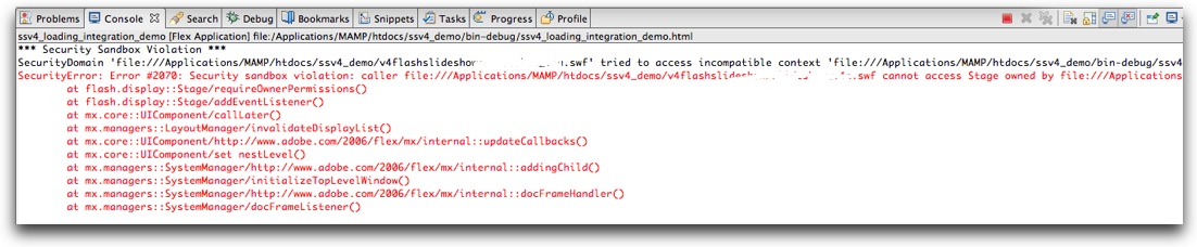 To fix this, you must add all of the SWF files being used (both your project SWF's as well as the v4flashslideshow/ supporting files folder) as trusted local content in the Flash Player security settings dialog. To learn more about doing this, see this topic.