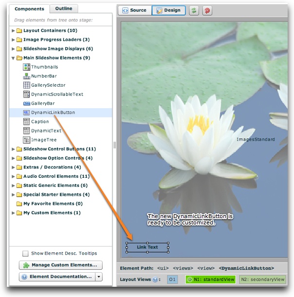 Now, open the wizard and switch to the Layout / Presentation section. Select the layout view where you want to add the purchase button; this will usually be the same view as that which displays the images. Drag a new DynamicLinkButton element onto the stage from the Main Slideshow Elements section of the Components Panel: