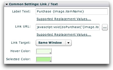 The Label Text is set to be Purchase {image.itemName} . By using the replacement value, this will make the button display for example 'Purchase Red Toy Car'. The Link URL is set to: