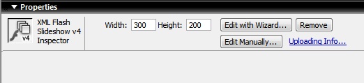 When you are working in Dreamweaver's Design View, this is the way your slideshows will appear. To actually view the slideshow, you must preview in the wizard or in a browser; this is explained in the Previewing Slideshows section of the documentation. To make changes, click the rendering once to select the element. In the Properties Panel (also known as the Property Inspector; accessed via Window > Properties), you should see the Slideshow Inspector:
