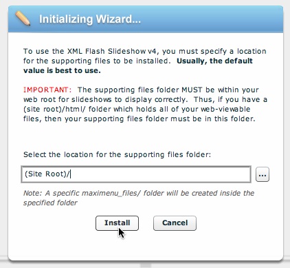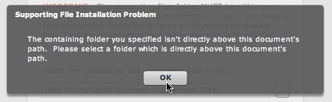 The Dreamweaver site's root root folder (the "site root") is the default location for the supporting files folder. (This results in the files being placed at, for example, (site root)/v4flashslideshow/slideshow.js ). IMPORTANT: This default location is appropriate for most setups. However, if your site root is not the same as your web root, you should install the files to your web root instead of your site root. For example, some webservers require that you place all web-accessible files in the htdocs/ folder. In this example, the file at (site root)/htdocs/index.html would map to http://www.mydomain.org/index.html . In this type of setup, you must select the (site root)/htdocs/ folder as the installation location. If you don't place the supporting files in the web root (the htdocs/ folder in this example), they will be stored on the server, but won't be accessible from the web.