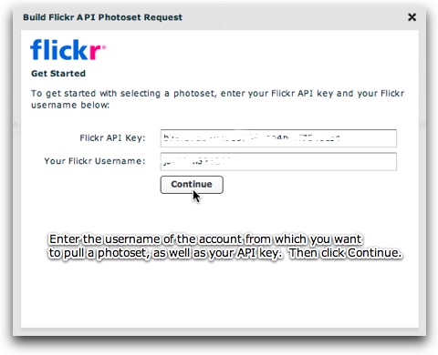 Once you click Continue, you will be prompted to enter the username of the Flickr account which holds the photoset(s) you want to use, and your Flickr API key:
