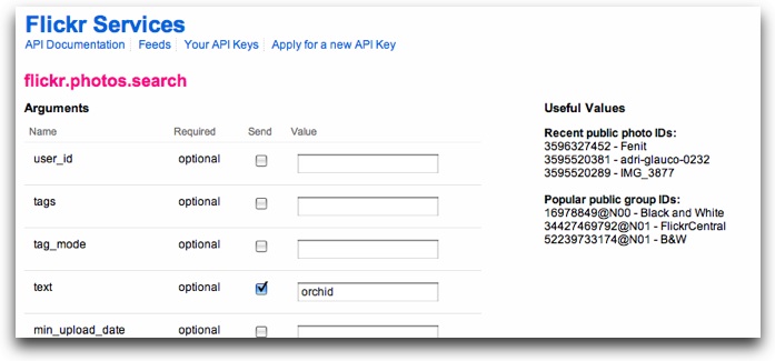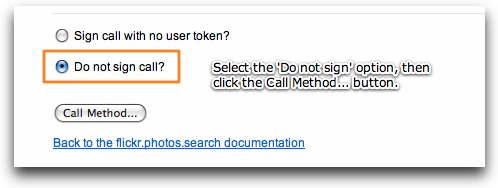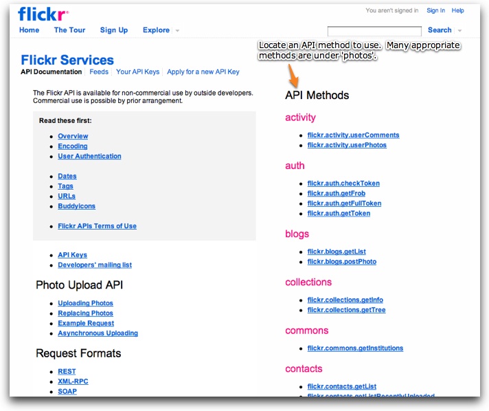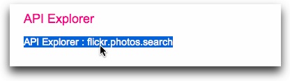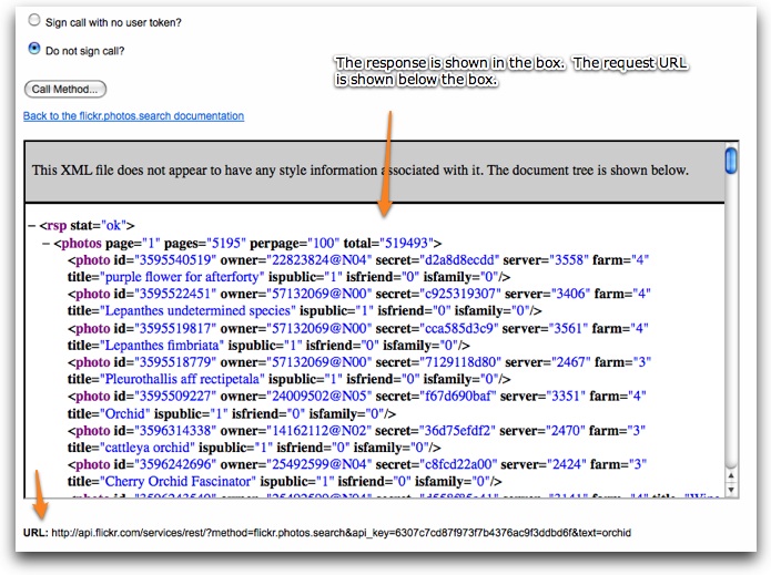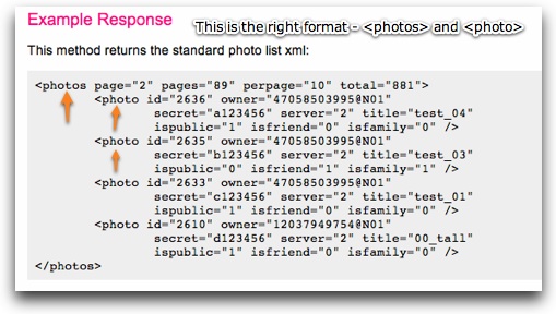 Most of the appropriate methods are under the 'photos' or 'photosets' headers. In this example, we'll use the flickr.photos.search method, which allows a search of all public photos. On the method detail page, verify that the response format under 'Example Response' is the <photos> format shown above. This is often referred to as 'photo list xml':