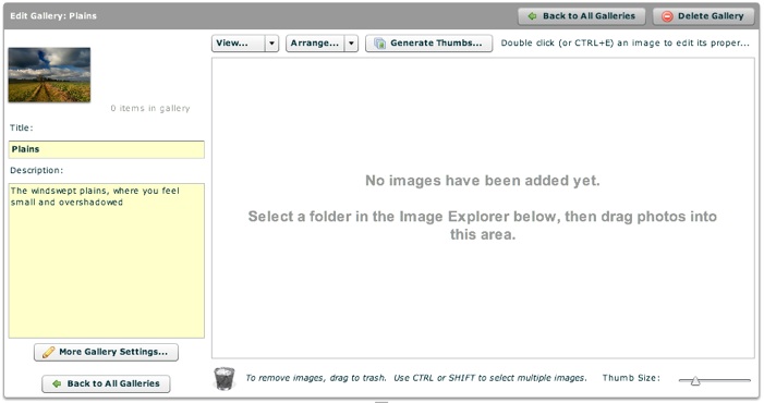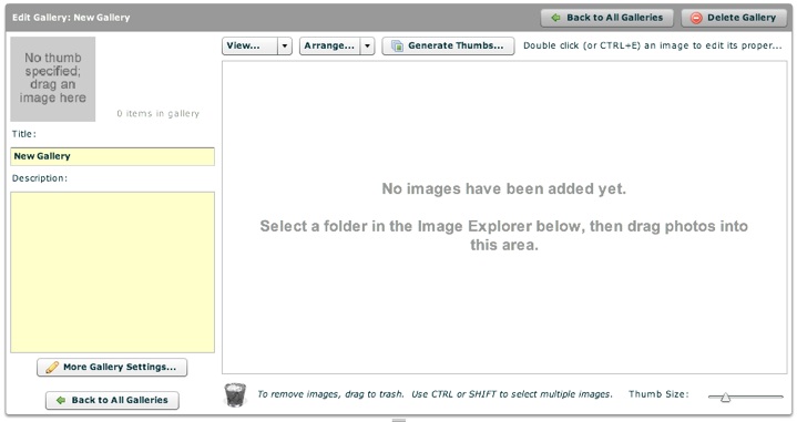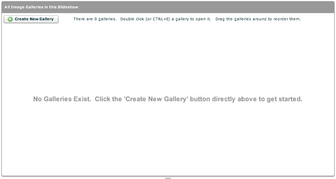 The Gallery Management Pane is where you will actually create the galleries and manage their constituent images. When you first create a slideshow, the pane appears as follows: