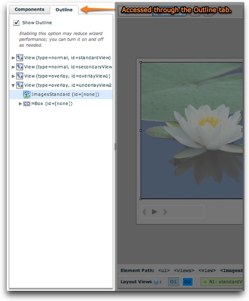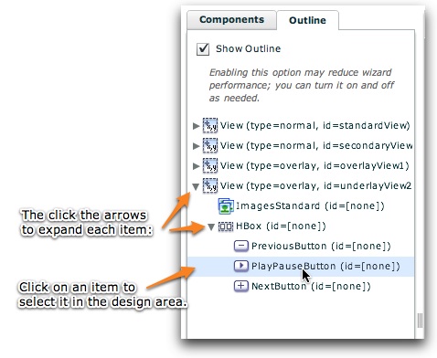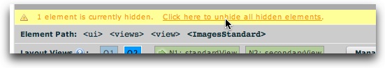 When enabled, a hierarchical tree view of layout views and their constituent elements is shown. To expand each expandable item, click the gray arrow at its left edge. Clicking on an item will select that element in the design area and allow you to edit its properties in the Properties Panel.