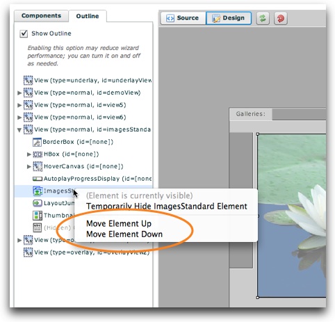 Move Item Up moves an item above its nearest sibling, toward the top of the visual stack (closer to the screen). Conversely, Move Item Down moves an item below its nearest sibling, towards the bottom of the visual stack (away from the screen). Note that the bottom of the outline tree represents the top of the visual stack, so Move Item Up actually makes the element move one place lower in the tree.