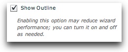 The outline tree should only be enabled when in use, as it may reduce wizard performance. After opening the Outline Panel, you can disable the outline by unchecking the 'Show Outline' checkbox: