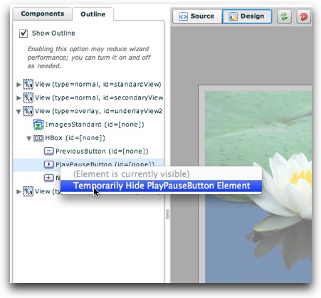 You can also temporarily hide (and unhide) elements from being visible in design view through the outline tree. To do this, right-click (Cmd+click) on an item in the tree and select 'Temporarily Hide Element Name Element':