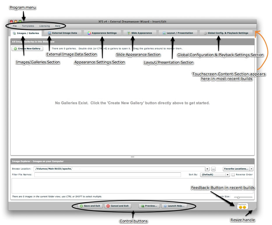 This section provides an overview of the wizard interface, especially general settings and options which are not slideshow-specific. The image below notes the identification names of the various sections in the wizard window: