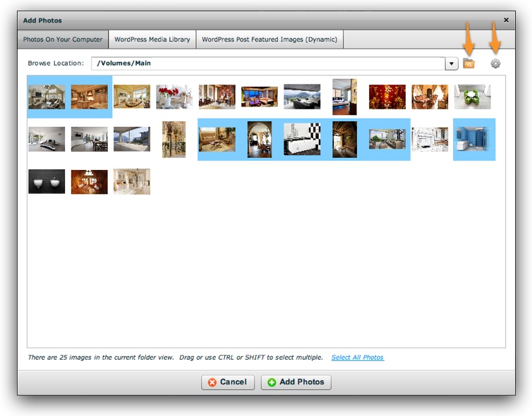 Use the browse button to select a folder where you have images. Click the gray cog button in the top right to show advanced options, such as thumb size, sorting and filtering. The photos in the folder will be displayed in the grid. For very large photos (e.g. > 4 MB), a placeholder will be shown in place of the real photo; hover over the placeholder to see a preview. Select photos in the grid by dragging, or clicking in combination with the CTRL or SHIFT key. You can use the link at the bottom to select all photos in the view. Clicking Add Photos will add the photos to your rotator and return you to the main view: